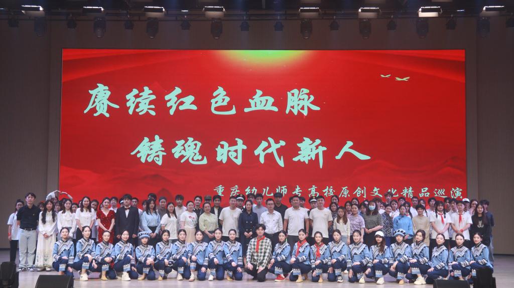 《血染红旗旗更红—校友蓝蒂裕》是我校师生自编自导自演的一部原创舞台剧,于今年5月入选了重庆市高校原创文化精品巡展巡演项目。该剧以红岩英烈蓝蒂裕为故事核心人物,以舞台剧这一艺术表现形式,通过在校学生的生动演绎,再现了重庆幼儿师专优秀校友蓝蒂裕不怕牺牲、同敌人顽强斗争的英雄事迹,是一堂融政治性、思想性、教育性、艺术性于一体的思政大课。