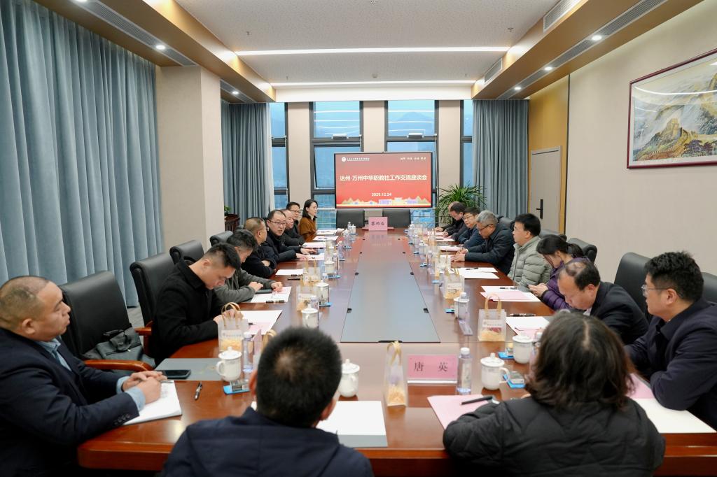 12月24日,达州中医药职业学院院长、达州市中华职教社社务委员会主任王钦,民建万州区委会主委、万州区政协副主席、万州区中华职业教育社主任祝智勇一行来校考察交流,交流座谈会在图书馆722召开。学校党委书记马文华出席,会议由祝智勇主持。