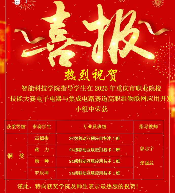 考务工作产教融合 当前位置: 首页 >> 产教融合 >> 正文 2025年重庆市职业院校技能大赛教育与体育赛道及电子电器与集成电路赛道获奖喜报 更新时间:2026-01-12 09:56:21 信息来源: 浏览人数: 上一篇:2025年重庆市职业院校技能大赛艺术设计赛道视觉艺术设计及数字艺术设计获奖喜报 下一篇:2025年重庆市职业院校技能大赛艺术设计赛道视觉艺术设计及数字艺术设计获奖喜报