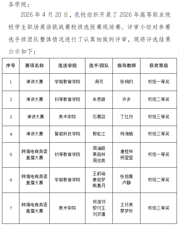 考务工作产教融合 当前位置: 首页 >> 产教融合 >> 正文 2026年高等职业院校学生职场 英语挑战赛校级现场赛评选结果的公示 更新时间:2026-04-21 10:45:20 信息来源: 浏览人数: 上一篇:关于2026年第八届青年教师教学竞赛校级选拔赛现场赛评选结果的公示 下一篇:关于2026年第八届青年教师教学竞赛校级选拔赛现场赛评选结果的公示