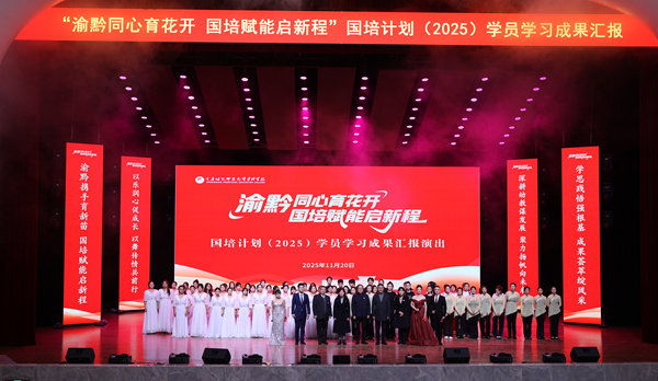 马文华在致辞中向重庆市教委、贵州省教育厅及各合作单位对学校发展和“国培计划”项目的大力支持表示诚挚的感谢。他指出,“国培计划”作为推动教师专业成长、赋能区域教育高质量发展的重要平台,是深入贯彻“强国必先强教,强教必先强师”战略部署的关键举措,为渝黔两地教师搭建了共学共进、互促提升的桥梁。本次汇演既是对培训成果的集中展示,也是对教育初心的深情回望。他希望全体学员大力弘扬教育家精神,秉持学以致用、锐意进取的态度,将培训成果转化为扎实的教学实践和创新动力,在扎实推进教育强市、教育强省建设中再创佳绩、再立新功。