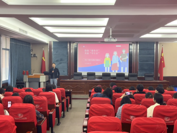 为引导学生干部端正角色认知、锤炼优良作风、提升服务能力,时代声音传播社于4月10日在“一站式”学生社区开展学生干部作风建设专题培训。培训面向梨园校区三个学院,以“勤做‘服务员’,莫做‘学生官’”为主题,由社团指导老师向覃担任主讲,共计120余名学生干部参训。