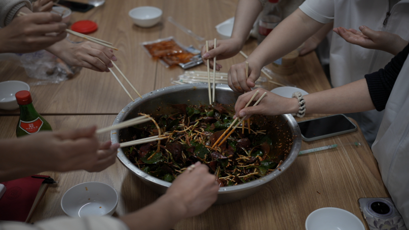 活动前期,学院团总支精心勘察活动路线,制定详细安全预案。出发前,带队老师陈碧会围绕野外安全、植物识别、环境保护等内容开展专题教育,明确“不随意采食、不破坏植被”的行为准则,引导学生在亲近自然的同时树立生态意识与责任意识,为活动安全有序开展奠定基础。活动中,同学们以小组为单位,在指定区域认真辨识、细心采挖折耳根。泥土芬芳间洋溢着欢声笑语,田间地头成为生动的劳动课堂。通过亲身参与,大家深刻体会到“一分耕耘一分收获”的劳动真谛,在协作中拉近了彼此距离,增强了团队凝聚力。采摘结束后,师生返回“一站式”学生社区,共同完成折耳根的清洗、择选与处理,并开展“凉拌折耳根”制作活动。同学们发挥创意,调配酱料佐料,制作出风味各异的凉拌菜品。大家围坐一起,品尝劳动成果,分享春日感悟,让劳动从体力付出升华为情感纽带与生活艺术。
