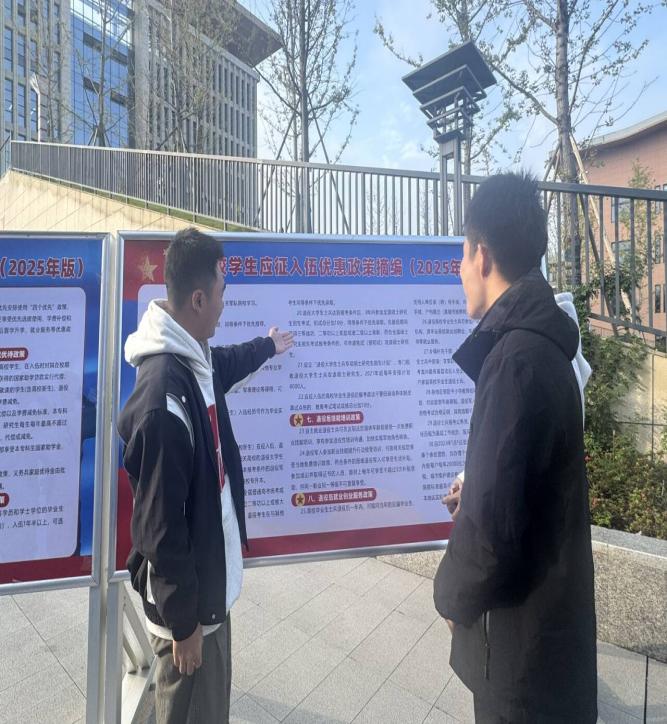在宣传会现场,工作人员分工明确、各司其职。一方面,安排专人负责引导人流、维护现场秩序;另一方面,组织熟悉征兵政策的成员在咨询区开展“一对一”精准答疑,解答内容广泛涵盖入伍流程、部队生活细节、学业衔接安排等学生普遍关心的热点话题。同时,主办方现场发放《校学生应征入伍优惠政策摘编(2025年版)》,对大学生入伍在学费减免、升学优惠、就业扶持等方面享有的专属福利进行了详细解读,助力学子们清晰了解参军的政策红利。此外,本次活动借助直观的政策展示、面对面的互动交流等有效方式,极大增强了活动吸引力,广泛普及了征兵基础信息,切实扩大了宣传覆盖面,吸引了众多学子主动参与。