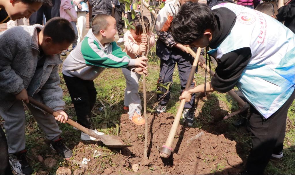 温暖三月学雷锋,植种绿意迎春风。在第45个植树节来临之际,为深入贯彻习近平总书记关于生态文明建设的重要讲话精神,践行“植绿、护绿、爱绿”的绿色文明理念,提高青少年的绿化环保意识,引导孩童亲近自然,共植共享美丽家园。2023年3月11日下午,我校“小夫子”志愿服务队在万州区沙河街道安乐村开展了以“植此青绿 散播绿意”为主题的志愿服务活动。