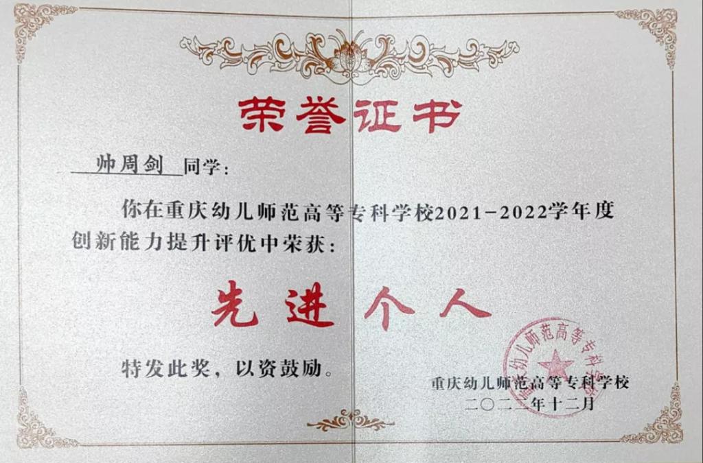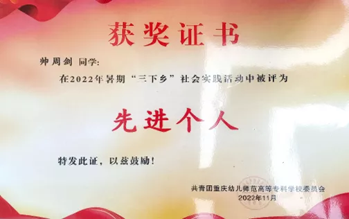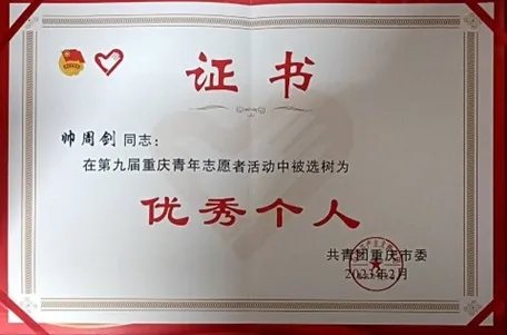 为深入学习宣传贯彻党的二十大精神,认真履行好共青团引领青年、组织青年、服务青年的职责使命,大力弘扬“奉献、友爱、互助、进步”的志愿精神,引导广大团员青年培育和践行社会主义核心价值观,团市委选树了100个集体为第九届重庆青年志愿者优秀集体,50人为第九届重庆青年志愿者优秀工作者,147人为第九届重庆青年志愿者优秀个人。我校2021级数字媒体技术专业学生帅周剑获评优秀个人。