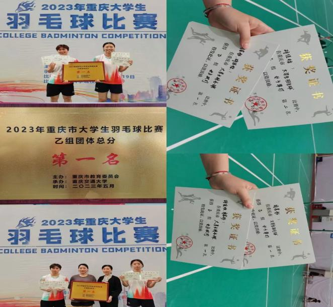 经过激烈角逐,我校羽毛球队斩获2023年重庆市大学生比赛乙组团体总分第一名,羽毛球队成员周星彤、胡佳怡荣获乙组女子双打第一名。