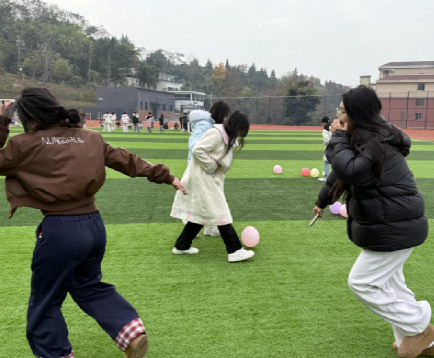 数字抱团与“赶鸡入笼”竞技环节将活动推向高潮。伴着轻快音乐,同学们根据主持人指令快速抱团,手忙脚乱的协作场景让欢乐持续升温;“赶鸡入笼”环节分为个人赛与团队赛,参与者用扇子驱赶气球入箱,个人赛的紧张冲刺与团队赛的默契配合相映成趣,获胜者斩获香片、精美挂件、笔记本等奖励,大家在竞技中释放压力,收获满满的成就感。
